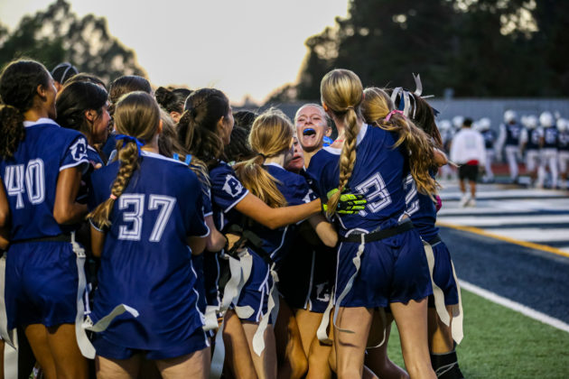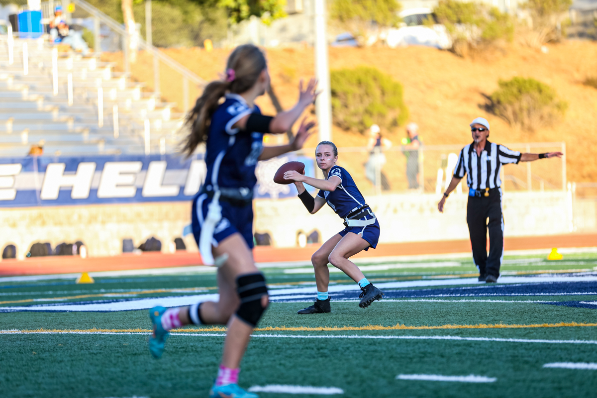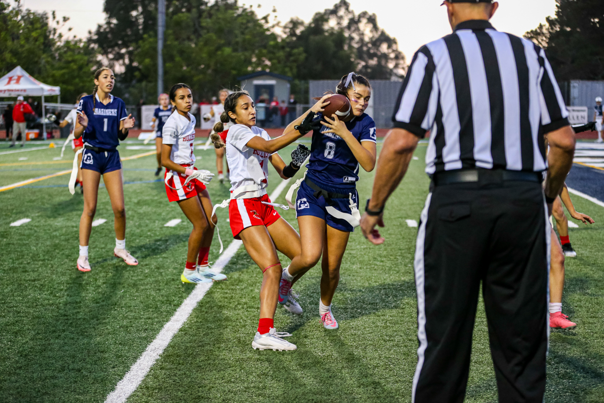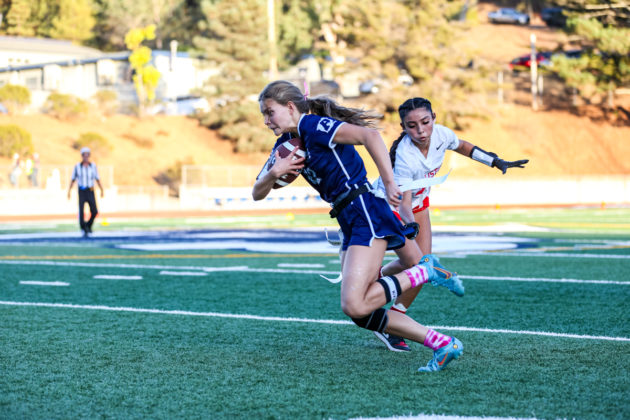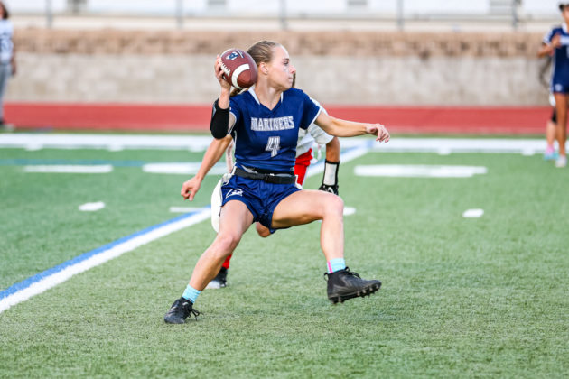 The first one was a down-to-the-wire thriller, as the Mariners girls’ flag football squad came from behind to edge the rival Balers, 18-12, in the early evening show. The nightcap went to visiting Hollister as it excelled in all three phases of the game to pull away from the Mariners football team in the second half en route to a 35-14 victory.
