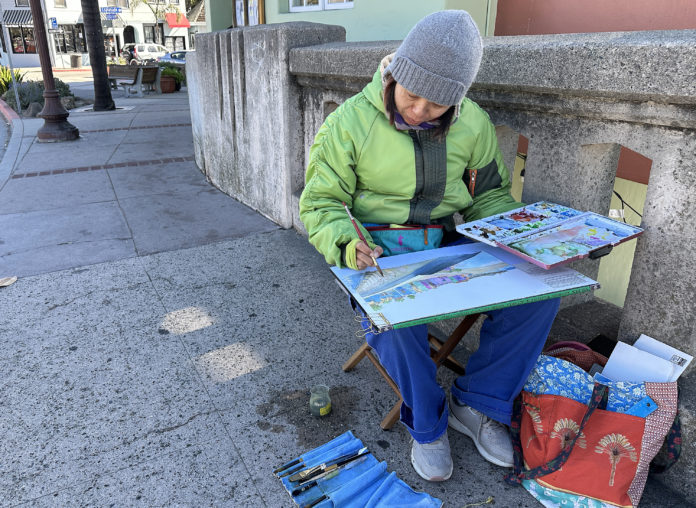 LOCAL ART Waverly Liu works on a watercolor painting of the Stockton Bridge in Capitola Wednesday morning. She joined 40 area artists as part of the annual Capitola Plein Air; Artists Paint the Town. From Oct. 21-26 artists fan out around the village to capture images in a variety of media. On Oct. 25, the public can meet the artists at Esplanade Park in the village between 10am-2pm. Then, on Sunday, an exhibition and sale takes place at New Brighton Middle School, 250 Washburn Ave. between 11am-4pm. For information, visit bit.ly/4dU0EYZ