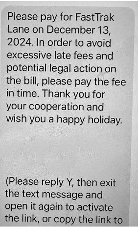 In addition, FasTrak—which operates more than 870 lane miles of interoperable tolled bridges, express lanes and roads in the Bay Area—says that drivers should disregard phishing texts being sent to their phones that show a specific outstanding toll amount.