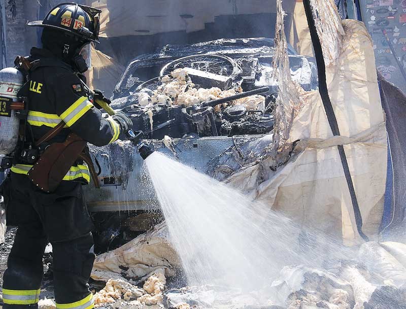 Watsonville firefighter Nate Tapiz douses hot spots in a car fire that erupted on the 100 block of Wagner Avenue Wednesday. Watsonville Fire Capt. Rick Pettigrew said the 2 p.m. fire melted a portion of a portable tent that covered the El Camino car that had a huge load of stored household items in its bed. The cause of the fire is still under investigation.