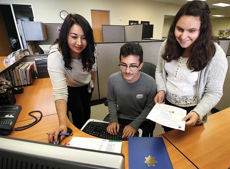(Andrea Curtis (left), executive assistant for the City of Watsonville, gives Watsonville High School seniors Juan Vargas and Yannely Collazo a run-through of the daily tasks at the administrative offices of the Watsonville Civic Plaza on Thursday. Photo by Erik Chalhoub/Pajaronian)