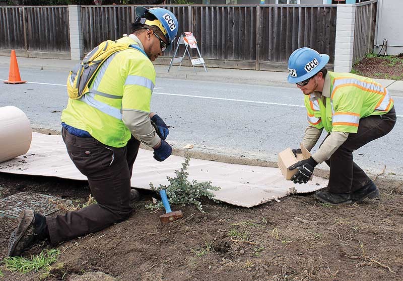 Crews from the City of Watsonville and California Conservation Corps are currently tearing out the grass on the median between Bronte and Tuttle avenues, and replacing it with drought tolerant plants, wood chips and drip irrigation.