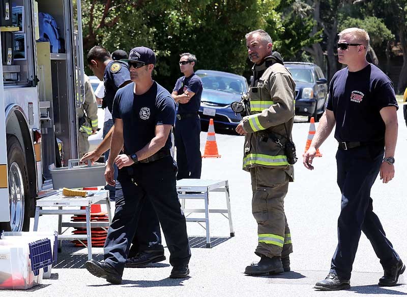 (Members of the Santa Cruz Hazardous Materials Interagency Team join Aptos/La Selva firefighters Friday on Sea Terrace Way Friday in Aptos where Sheriff’s deputies discovered an illegal drug lab inside a vacation rental home. Photo by Tarmo Hannula/Pajaronian)