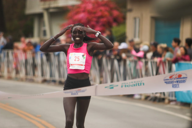 Everlyn Kemboi glanced behind her shoulder once moments just before covering her face as she came storming down Cliff Drive in Capitola to win Sunday morning’s Wharf to Wharf women’s division race.