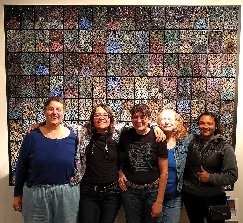 (Contributed photo: Kathleen Crocetti (center) and others stand in front of Crocetti’s work, “Tile Color Map: Seacliff Village Park,” at the R. Blitzer Gallery in Santa Cruz.)