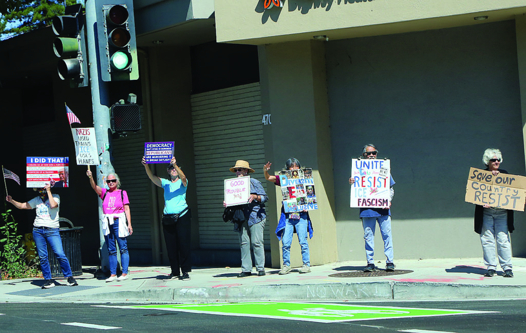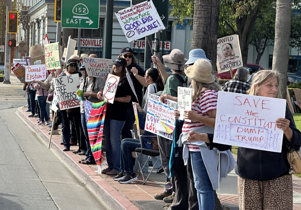 Around 200 people gathered at Watsonville Plaza Thursday as part of a nationwide movement to protest the Trump administration’s attack on civil and human rights. Organized by Indivisible Santa Cruz County, local union groups, Black Voters Matter, and others, the “Good Trouble Lives On” event brought a wide flurry of homemade signs, chants, and speeches on the anniversary of Congressman John Lewis’s passing “to defend our democracy and carry forward his legacy of Good Trouble,” organizers said. Scores of such demonstrations took place around the county, including Santa Cruz, Soquel, and Aptos. (Tarmo Hannula/The Pajaronian)