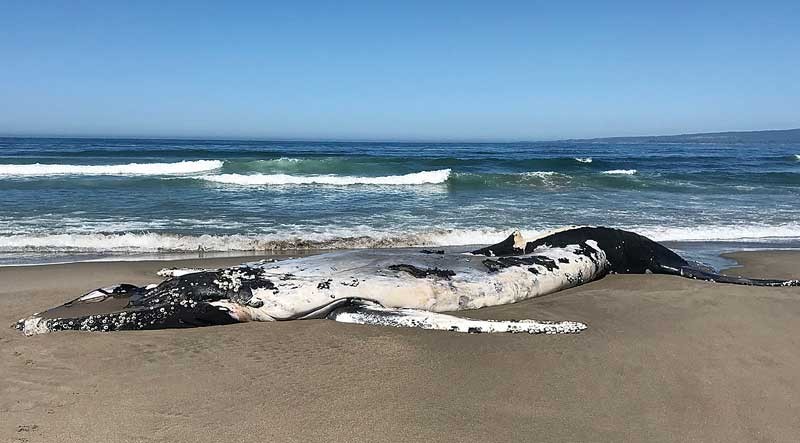 A 29-foot juvenile humpback whale is shown at the shoreline at Manresa State Beach Monday. Officials said it appeared to have been dead several days at sea before washing ashore several days ago. No cause of death was known to officials.