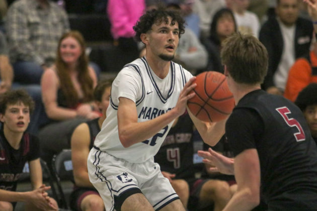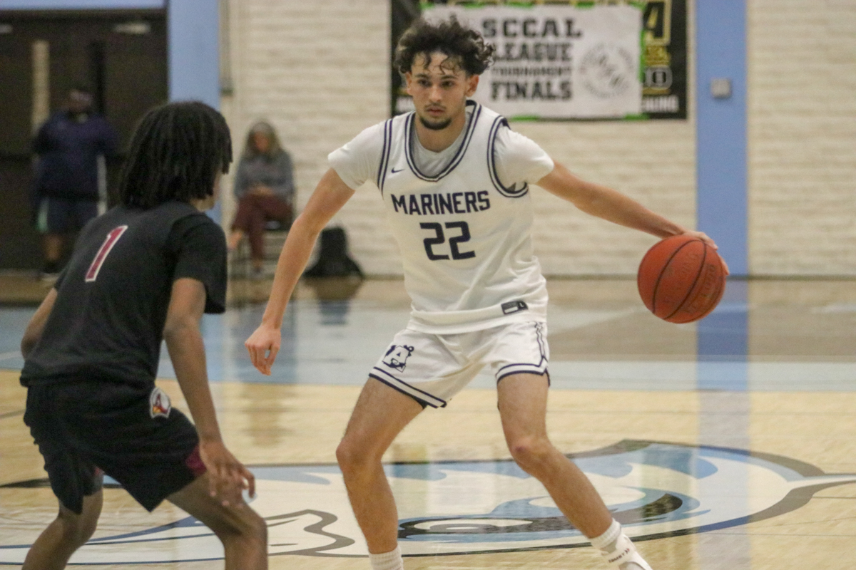 Aptos senior Ryan Solorio scored eight of his 11 points in the fourth quarter to help the Mariners rally past Santa Cruz, 43-41, in the Santa Cruz Coast Athletic League Tournament championship at Cabrillo College on Feb. 15.