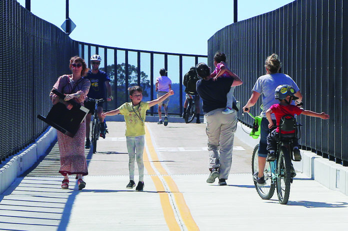 These folks take their first trek over the newly opened bicycle/pedestrian bridge that crosses Highway 1 in Live Oak Wednesday which is part of the Highway 1 Auxiliary Lane and Bus-on-Shoulder Project between 41st Avenue and Soquel Drive. (Tarmo Hannula/The Pajaronian)