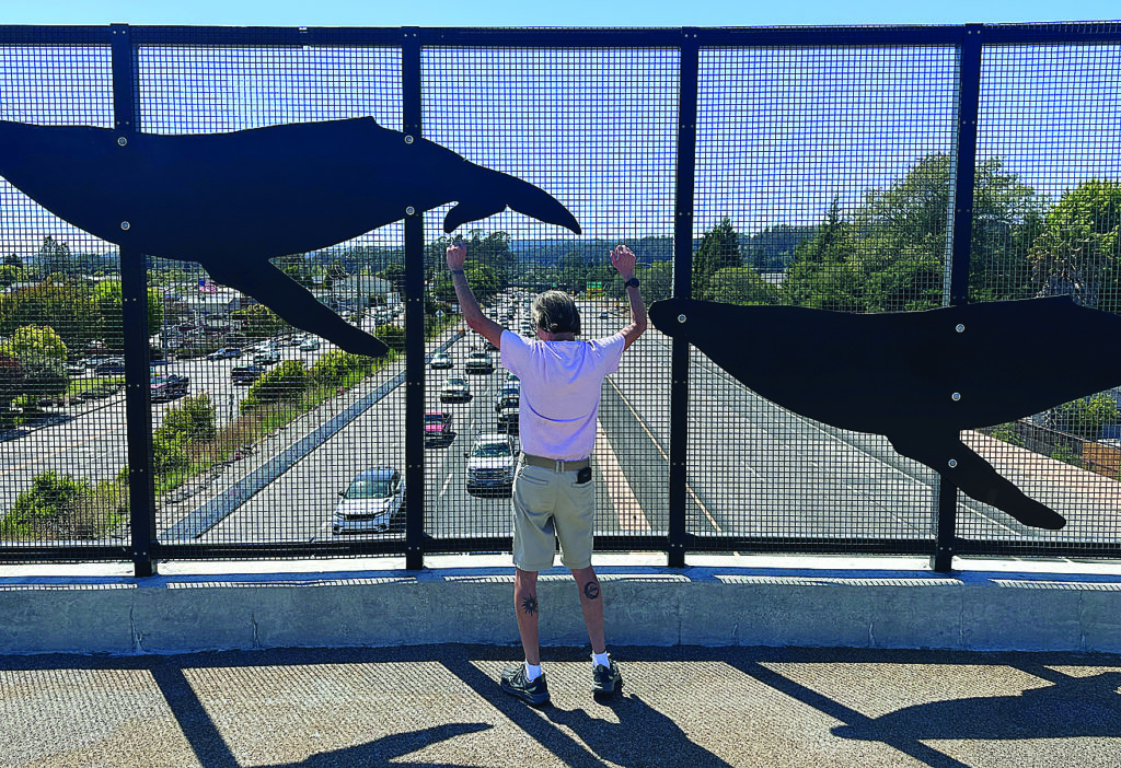 Erika Watson celebrates the opening of the bridge as traffic passes below on Highway 1 . (Tarmo Hannula/The Pajaronian)