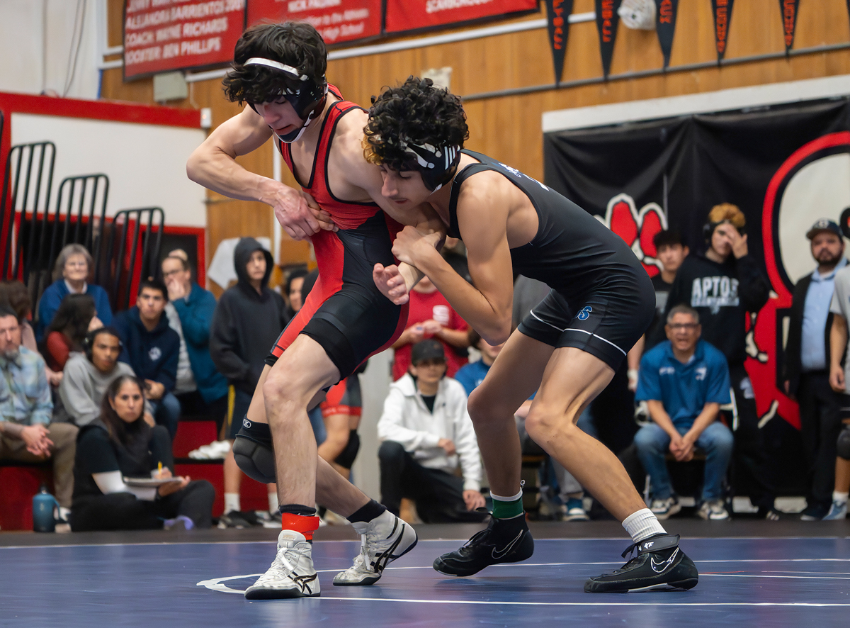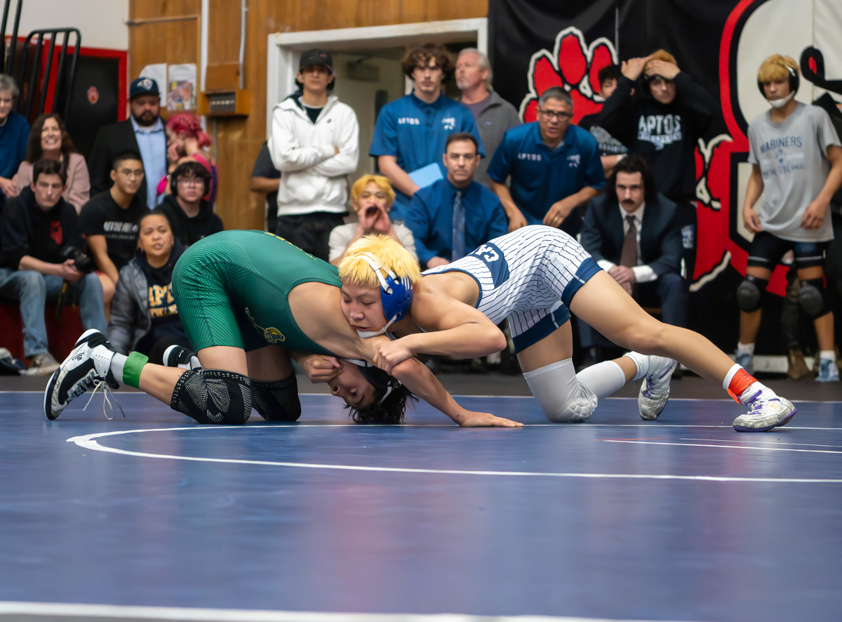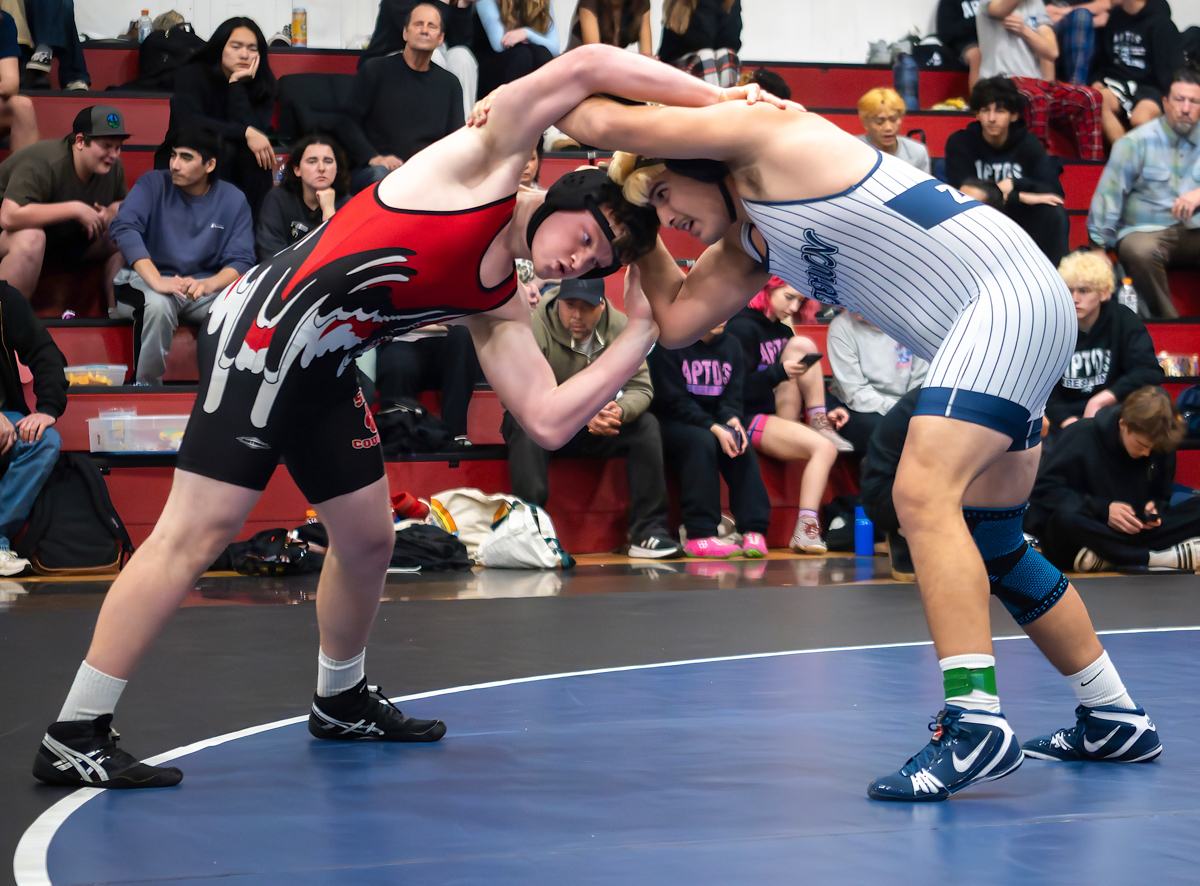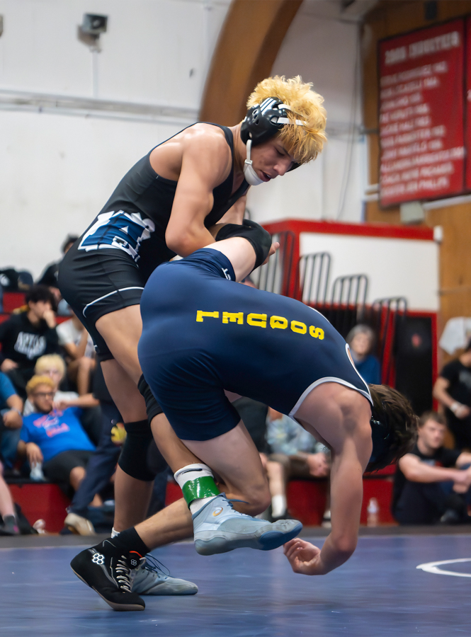The Cabot brothers—Alfred and Dominic—each won their matches in the 113 and 106-pound weight divisions, respectively, for Aptos. Teammate sophomore Cruz Contreras pinned Soquel junior Levi Larsen to capture the 126-pound division title, and sophomore Cole Moules (150 pounds) won his second straight league championship.
