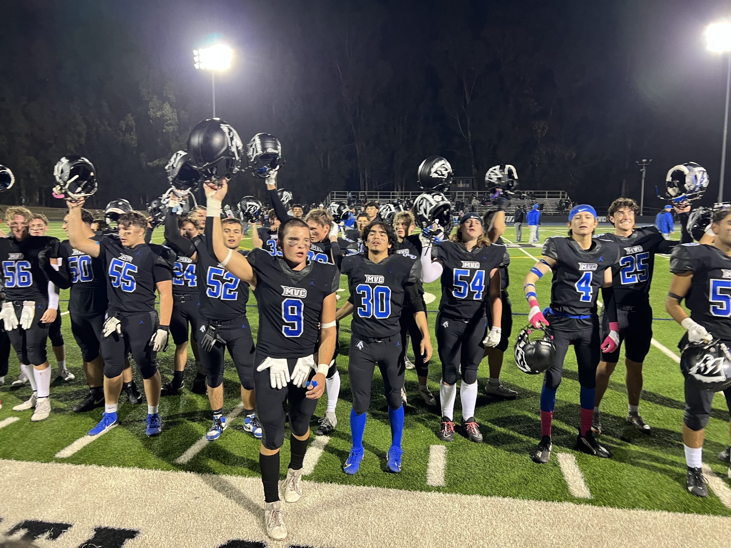 The Monte Vista Christian football team celebrates following its 42-23 crushing win over North Monterey County in Pacific Coast Athletic League Mission Division–North action Oct. 25. (Juan Reyes/The Pajaronian)