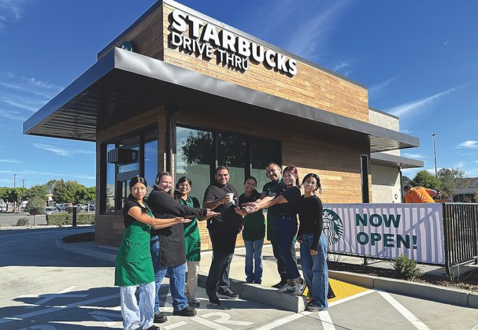 The staff extends an invitation the new Starbucks that opened Thursday morning at 1726 Freedom Blvd. Manager Christine Deschler (second from right) said they will offer the full range of Starbucks beverages, pastries and other goods. The drive-thru/walk up business will serve motor traffic and walk up orders at their outdoor patio with tables and chairs. This marks the seventh Starbucks in Watsonville.