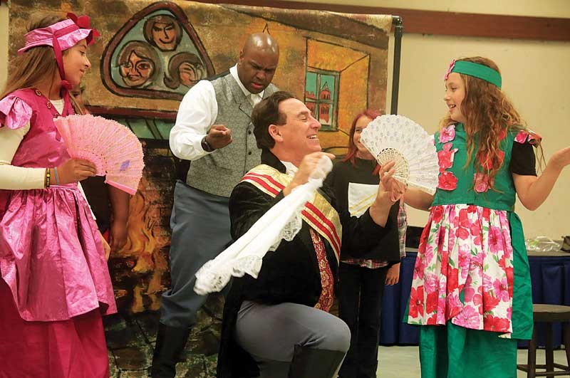 Marleena Carbajol (left) and Rebecca Fuller (right), students at Bradley Elementary School in Corralitos, take part in Rossini’s “La Cerenentola” — an Italian version of “Cinderella” — put on by members of the San Francisco Opera Guild Thursday. Principal Brian Saxton, along with the Bradley Home and School Club and Ari Parker, sixth grade teacher, organized the event for Bradley students.