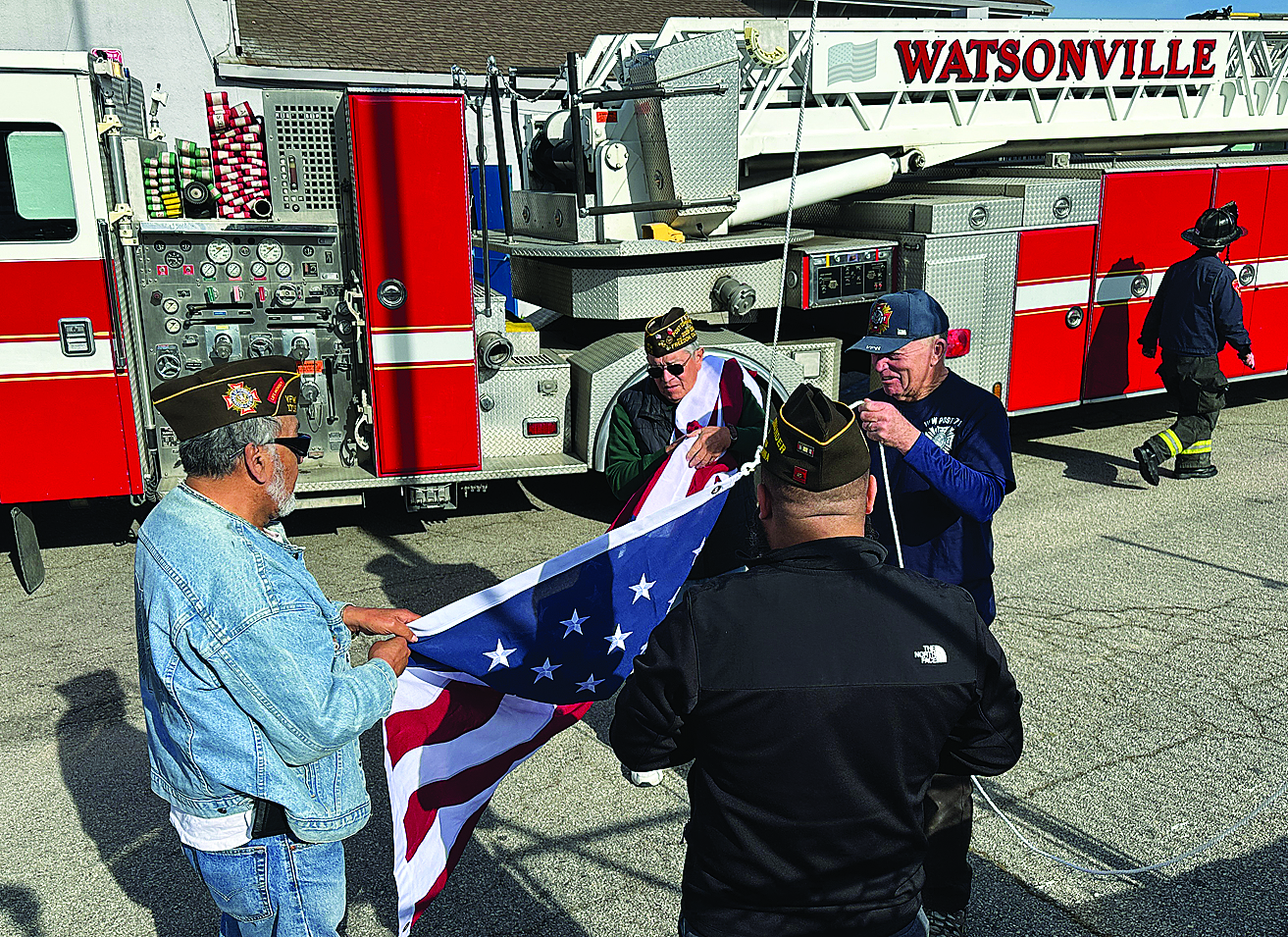 Thieves recently stole the American flag and a POW/MIA flag along with the rope. Veteran Bob Erbe (center, right) said VFW contacted Watsonville Fire to get with from tiller unit crew to reattach the rope and hoist the flags back to their original spot atop the pole. VFW officials did not file a police report.