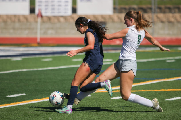 Aptos High sophomore Scarlet Stateler, right, and Mariners girls' soccer team were eliminated from the Central Coast Section playoffs following a 2-0 loss to Homestead in the Division II quarterfinals Feb. 22. (Juan Reyes/The Pajaronian)