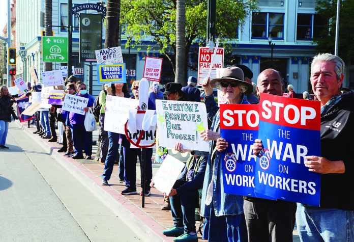 In Santa Cruz, about 100 people gathered at the Town Clock downtown and waved similar signs and heard speeches over a bullhorn honoring labor and at the same time denouncing Trump’s policies. The group eventually marched through downtown Santa Cruz to carry their message along Pacific Avenue.