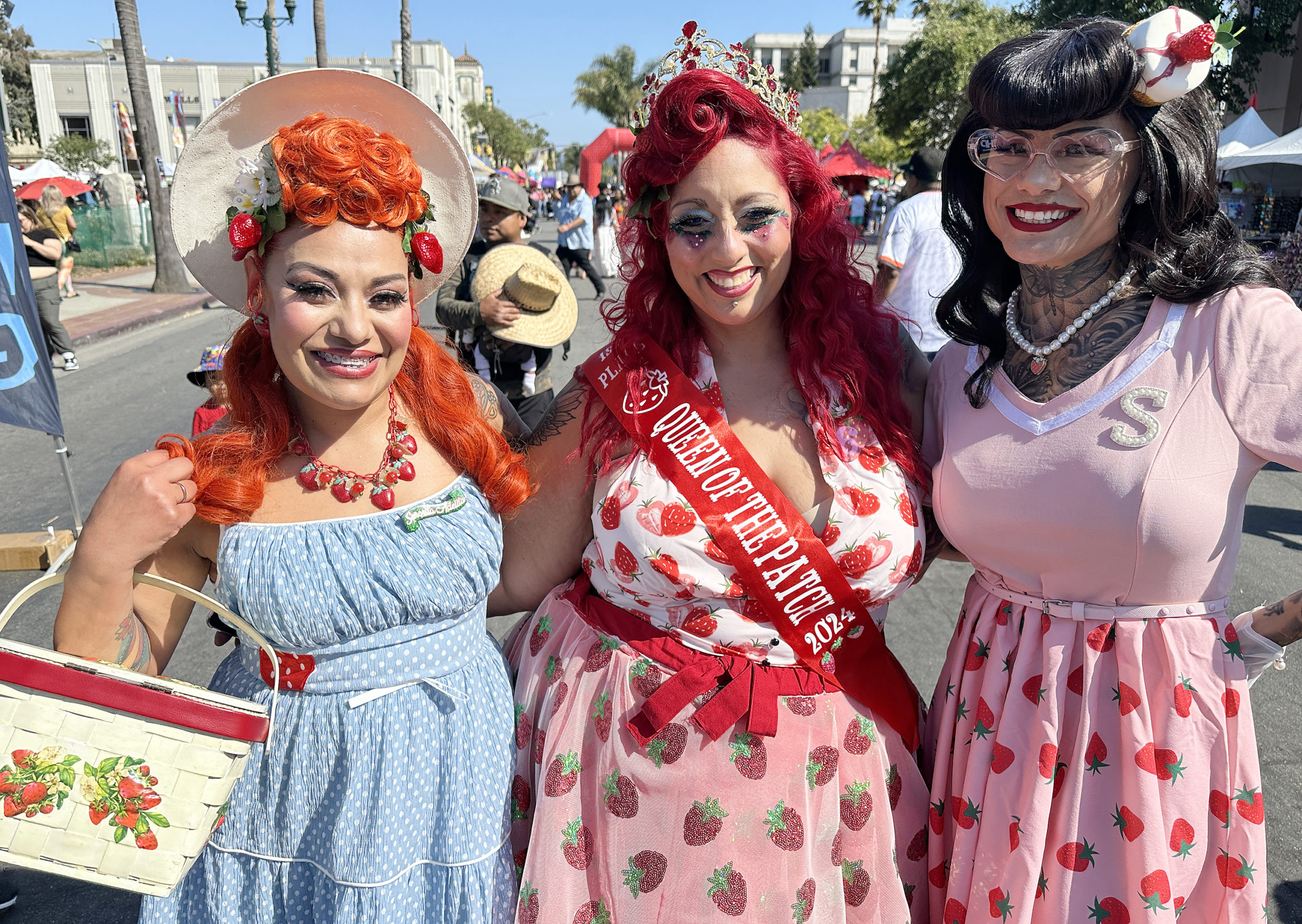 Queen of the Patch, Andrea Juarez-Smith (center) is joined by Aracelli Gonzalez (left) and Sadde Doll Contesta at the annual Watsonville Strawberry Festival Saturday. The woman are also of the group, Diamond Damsels. (Tarmo Hannula/The Pajaronian)