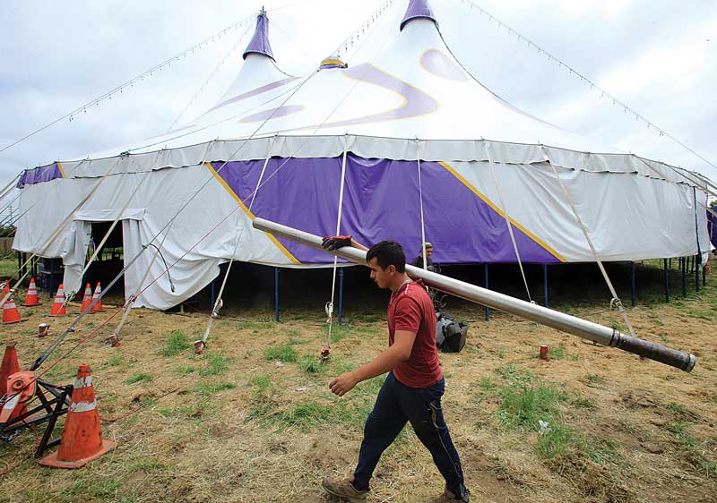 Workers were busy Tuesday putting up the big-top tent that will house the show, which takes place in the empty field next to East Lake Village Shopping Center on East Lake Avenue.