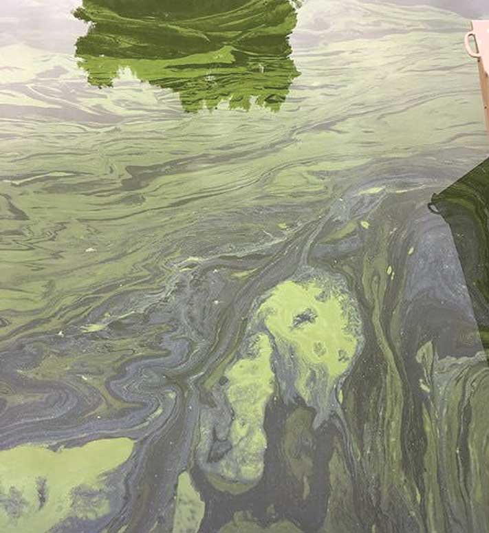 Cyanobacteria flourish in the lake thanks to the phosphates running off from agricultural and residential uses, and from erosion of riverbanks.